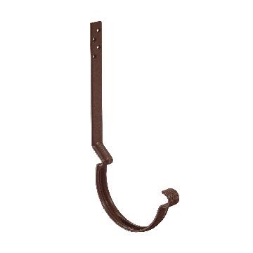 Поставляется с комплектом креплений. Конструкция крюка имеет более вытянутое и глубокое ребро жесткости, поэтому крюк выдерживает повышенные силовые нагрузки. Передний замок крюка фиксирует завиток желоба снаружи, и благодаря этому желоб удобно монтировать даже после установки фартука-капельника. Задний замок имеет конструкцию, исключающую смещение желоба под нагрузкой. Отверстия под крепеж выполнены с зенковкой под шляпку в потай. На передней части крюка расположен фирменный штамп - лилия.